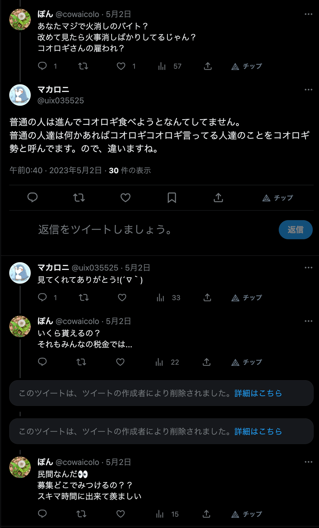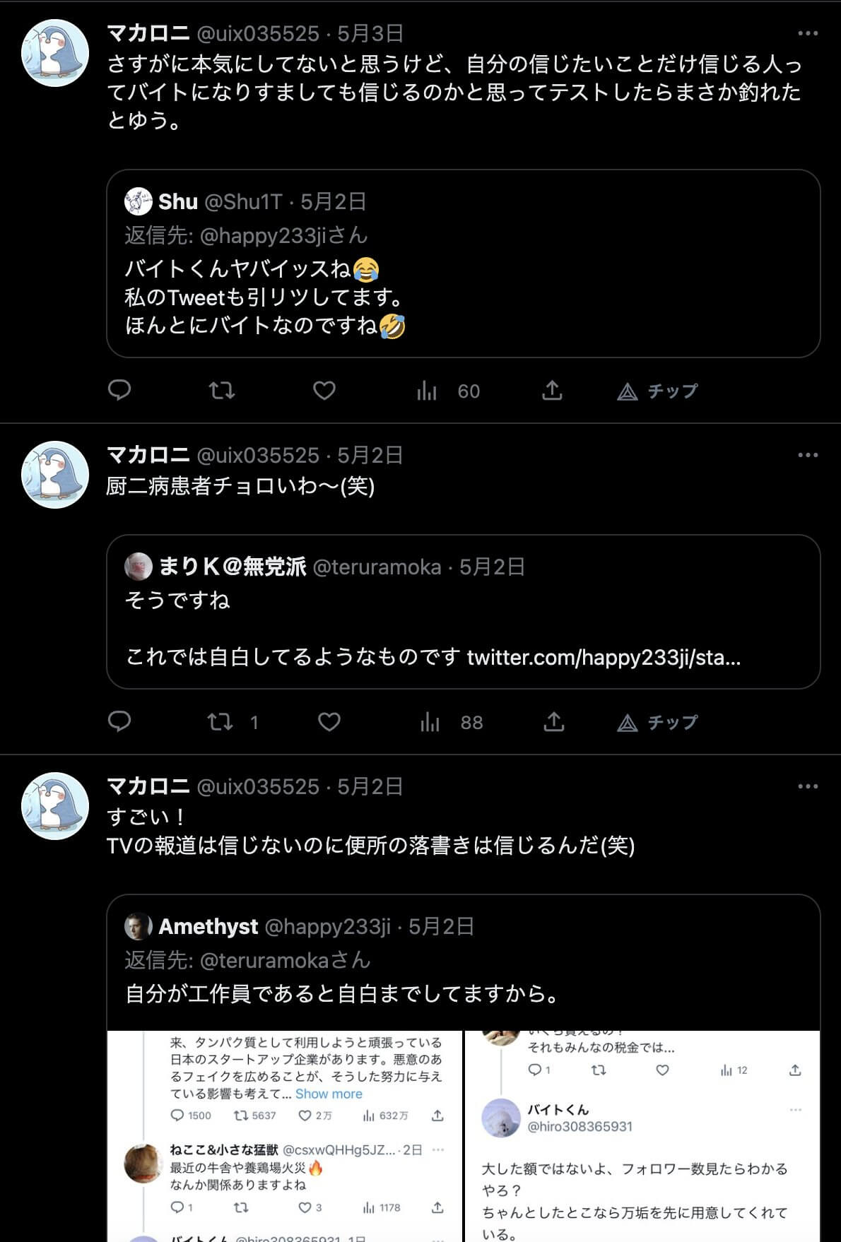 この工作員は工作員であることがバレたようなので、アカウント名を「バイトくん」から「マカロニ」に変えており、上記のツイートも証拠隠滅のために削除していました。